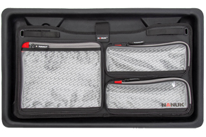 Fits NANUK 938 cases. Installs with supplied screws to lid posts or 2 sided Velcro Tape. Large pouches with zippers.